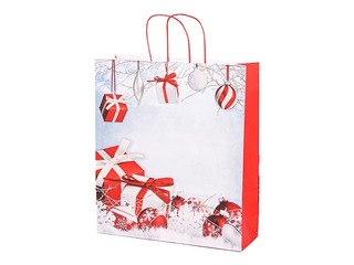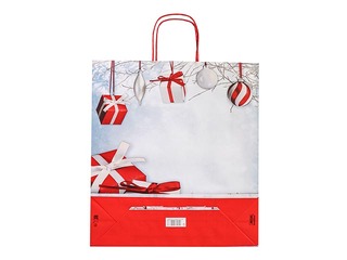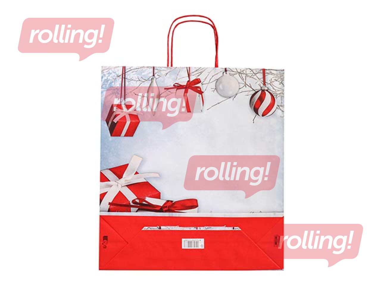 Papīra dāvanu maisiņš ar sarkaniem rokturiem un dizainu.