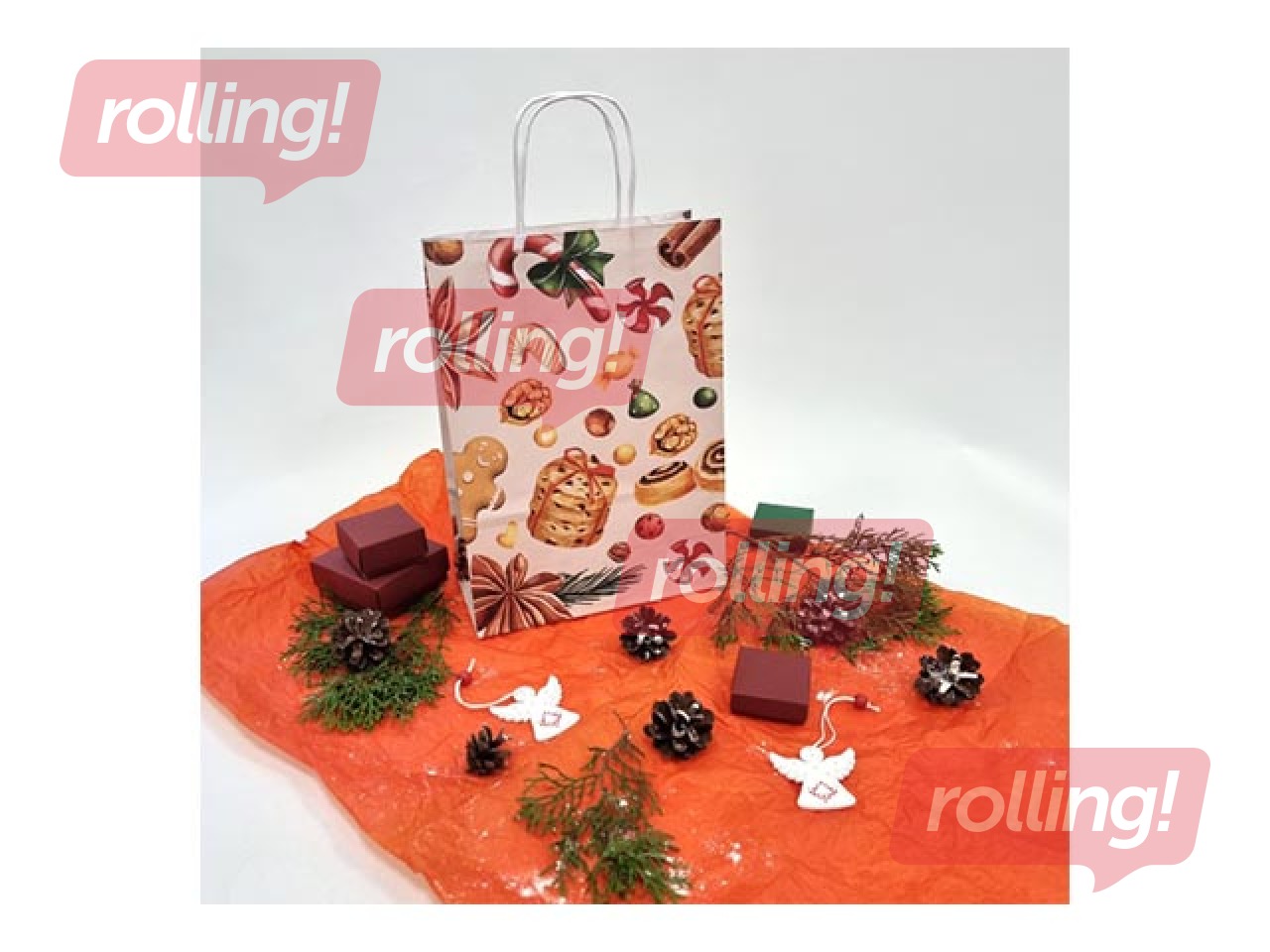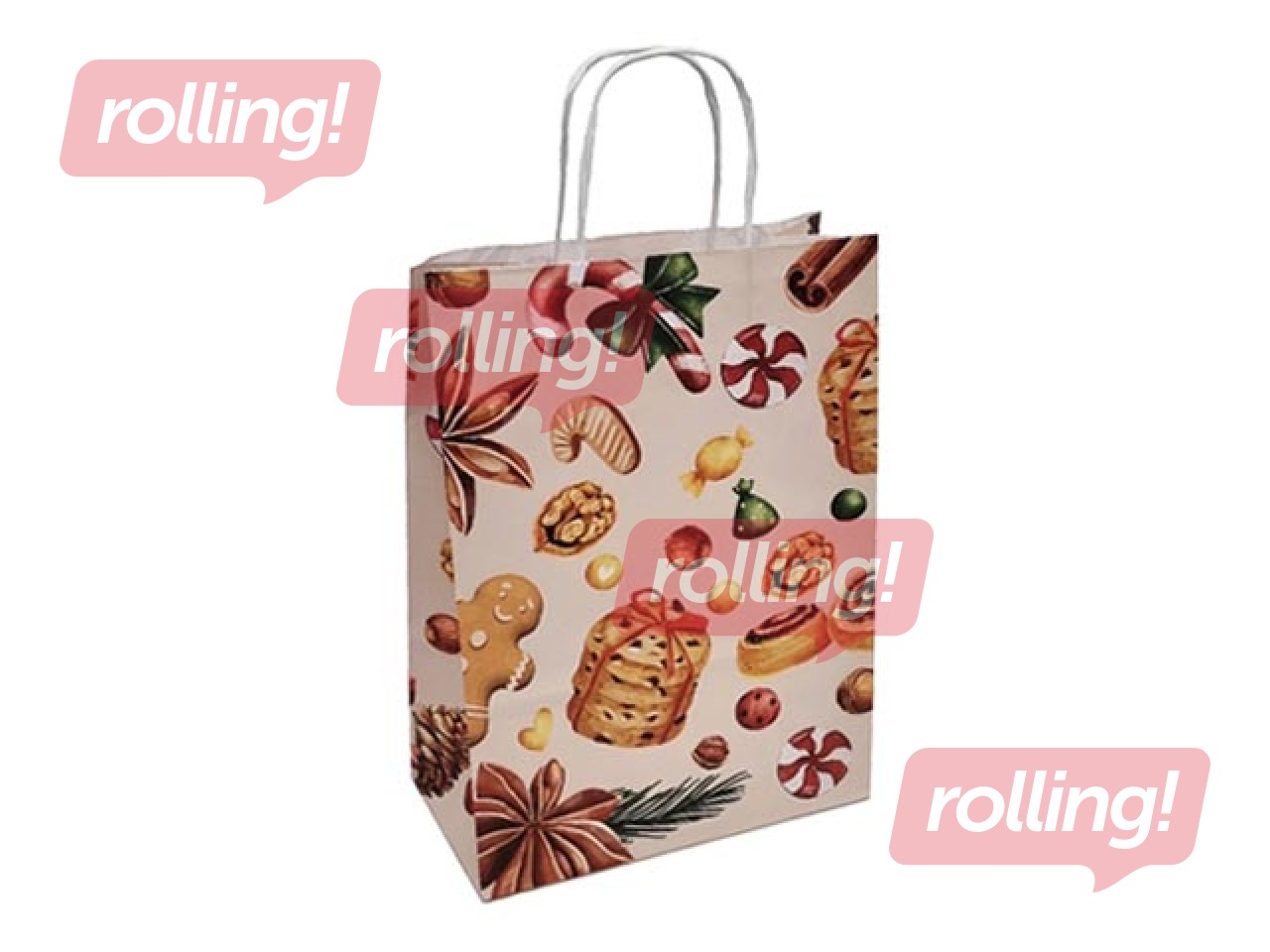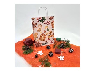 Papīra maisiņi - ar vītiem rokturiem un Ziemassvētku tematikas dizainu.