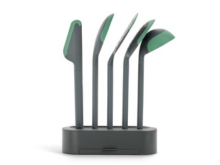 Non-Scratch virtuves piederumu komplektā ietilpst 5 neaizvietojami rīki: servēšanas karote, lāpstiņa griešanai, putu karote, knaibles un zupas karote. Komplektā ietilpst arī statīvs, kura pagarinātā forma ļauj optimāli izmantot vietu uz virtuves virsmas, kā arī papildu paliktnis piederumu novietošanai, lai darba virsma paliktu tīra.